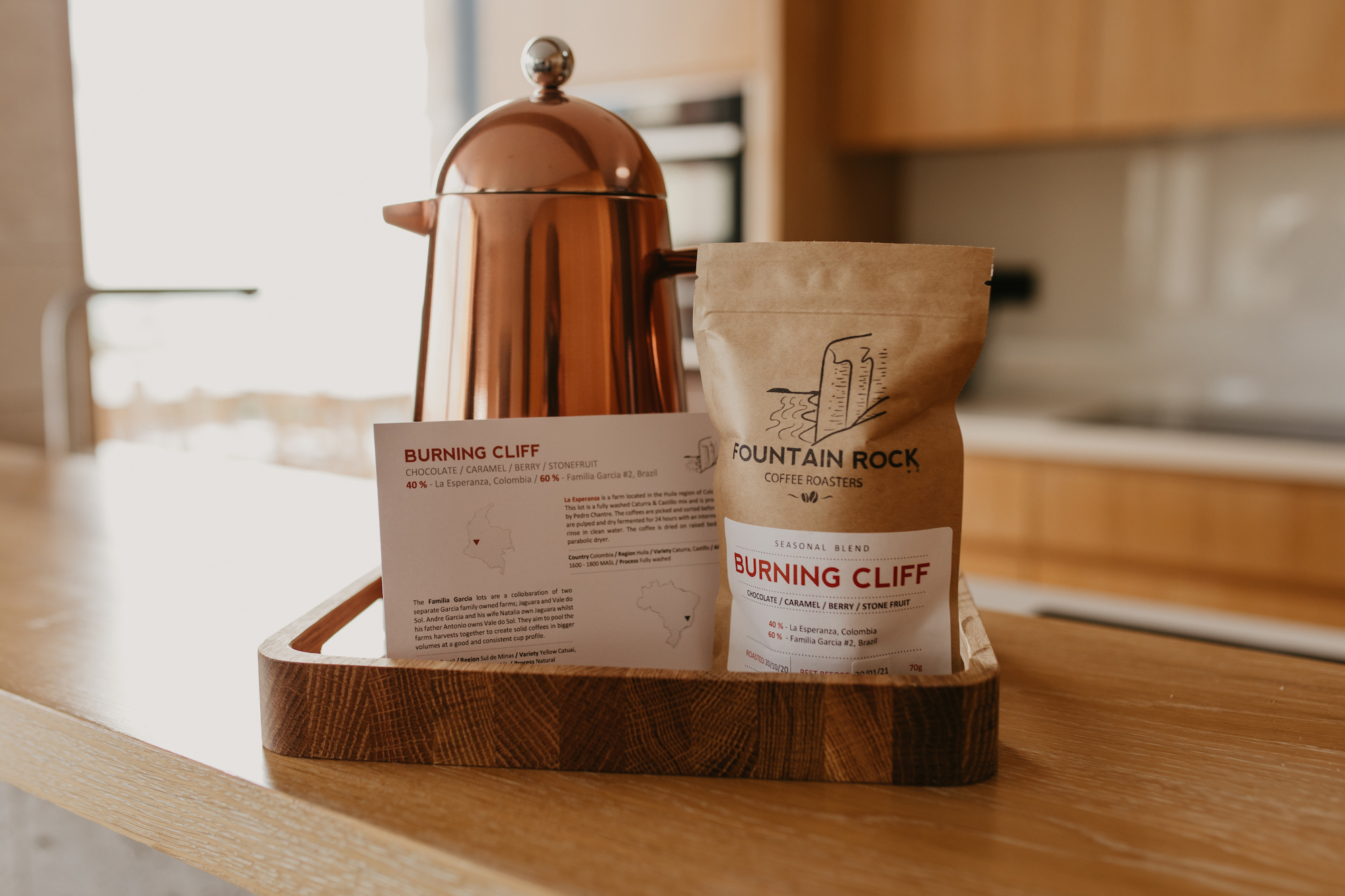 As the coffee crop harvests change, so do the components of our Burning Cliff Seasonal Blend. This blended coffee is super smooth and velvety with notes of chocolate, caramel, berry, forest fruit jam and stone fruit.